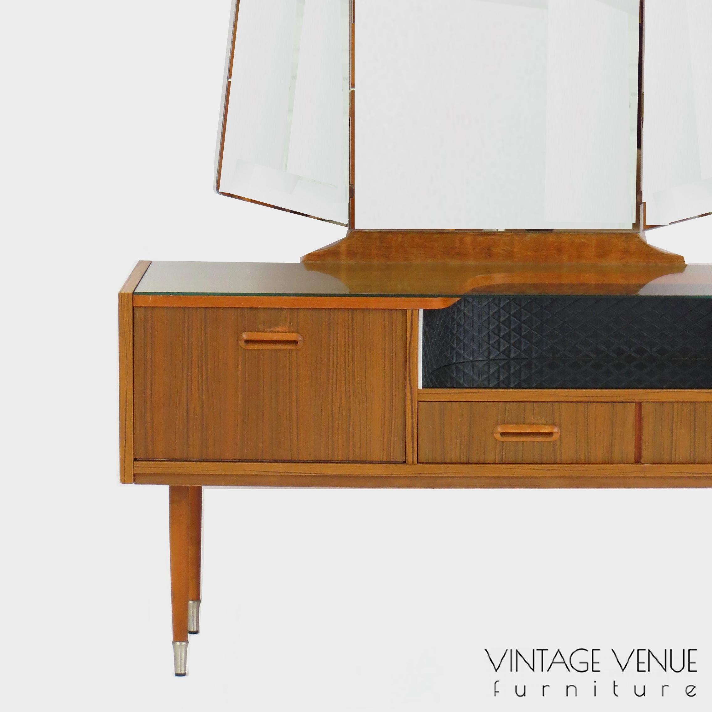 Mid century teak dressing table sideboard with (folding) mirror, two drawers and flap compartment with beautiful carved handles & legs, made in the 1950s / 60s. The dressing table is in good condition and has light signs of use appropriate to its age. The dimensions are as follows: